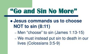 11 She said, “No one, Lord.” And Jesus said to her, “Neither do I condemn you; go and sin no more.”