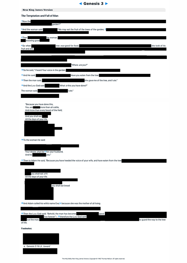 I give you a sample below of a page from the Bible and how it might be taught as redacted by some “teachers and pastors” in the churches today. It’s just an example. If you listen to preaching long enough from various teachers, preachers you would have a real idea of just how THIN their Bibles might be.